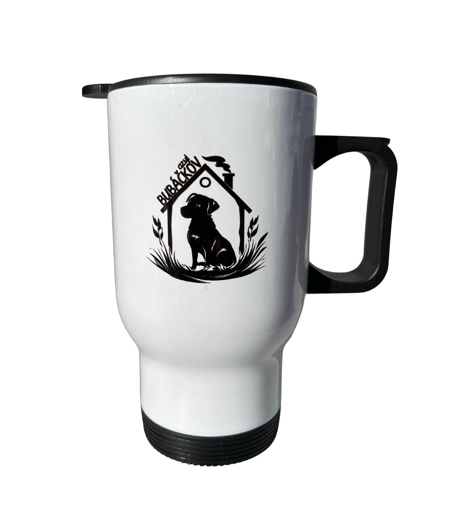 Termohrnek s logem našeho azylu Bubáčkov – každý doušek pomáhá pečovat o pejsky v našem psím důchoďáku.