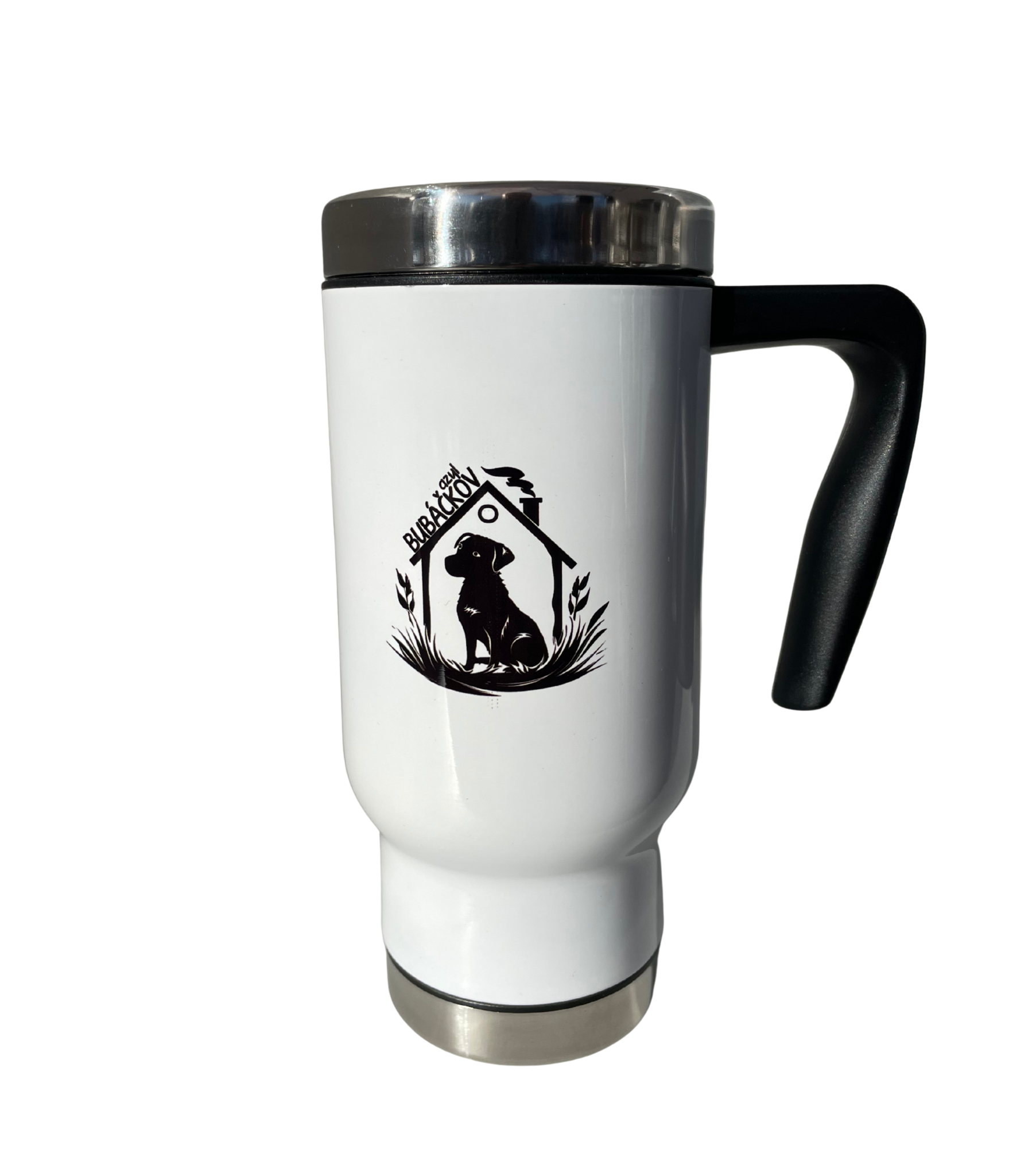 Termohrnek s logem našeho azylu Bubáčkov – každý doušek pomáhá pečovat o pejsky v našem psím důchoďáku.